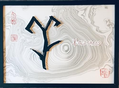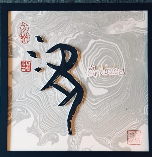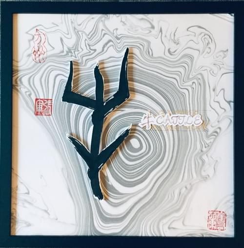 墨流书法小品。作品的形式为以独一无二的墨流画,载入12生肖甲骨文。两种古老文化元素的交汇,体现了作者对其所呈现在水墨线条和黑白空间的艺术魅力,有独到的眼光和创作力。 作品尺寸:30 / 30 公分;甲骨文为刻字半浮雕。